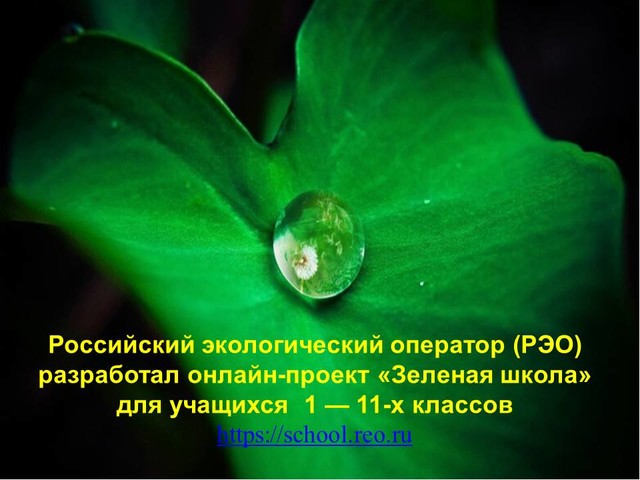 Российский экологический оператор (РЭО) разработал онлайн-проект «Зеленая школа» для учащихся 1 — 11-х классов. Для школьников подготовили видеоролики, где рассказывается о переработке отходов. К началу учебного года уроки будут разосланы в тысячу школ России.